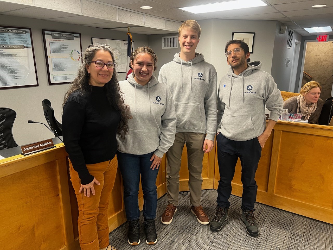 (Left to Right) Telluride Mayor DeLaine Young with Mitzi Ayala, Luke Stock, and Christian Vieweg (’22-23 VISTAs) at the AmeriCorps Week 2023 Proclamation reading.