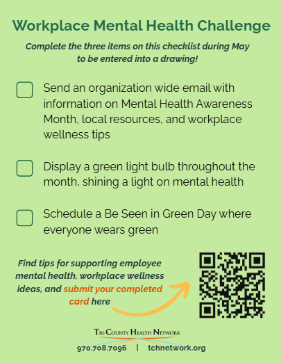 In addition to participating in our “Light Up for May” challenge, Tri-County Health Network encourages individuals and our communities to join us in showing support for mental health by participating in our “Be Seen in Green” challenge. It’s more than just a fashion statement; it’s a call to action, a symbol of solidarity, and a testament to the collective power of communities coming together in support of mental health.
